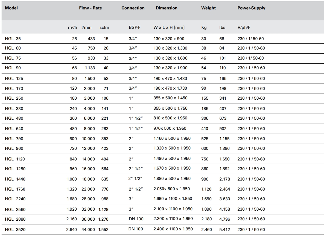- Требуемый воздух на входе HGL с комплектом фильтров FGO.K: класс ISO 8573 2.7(4).2
